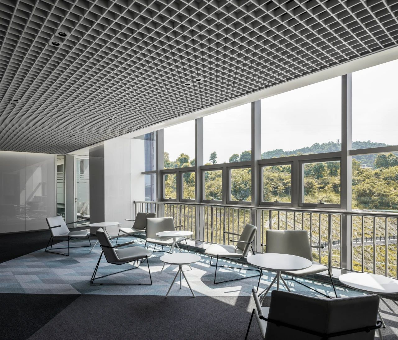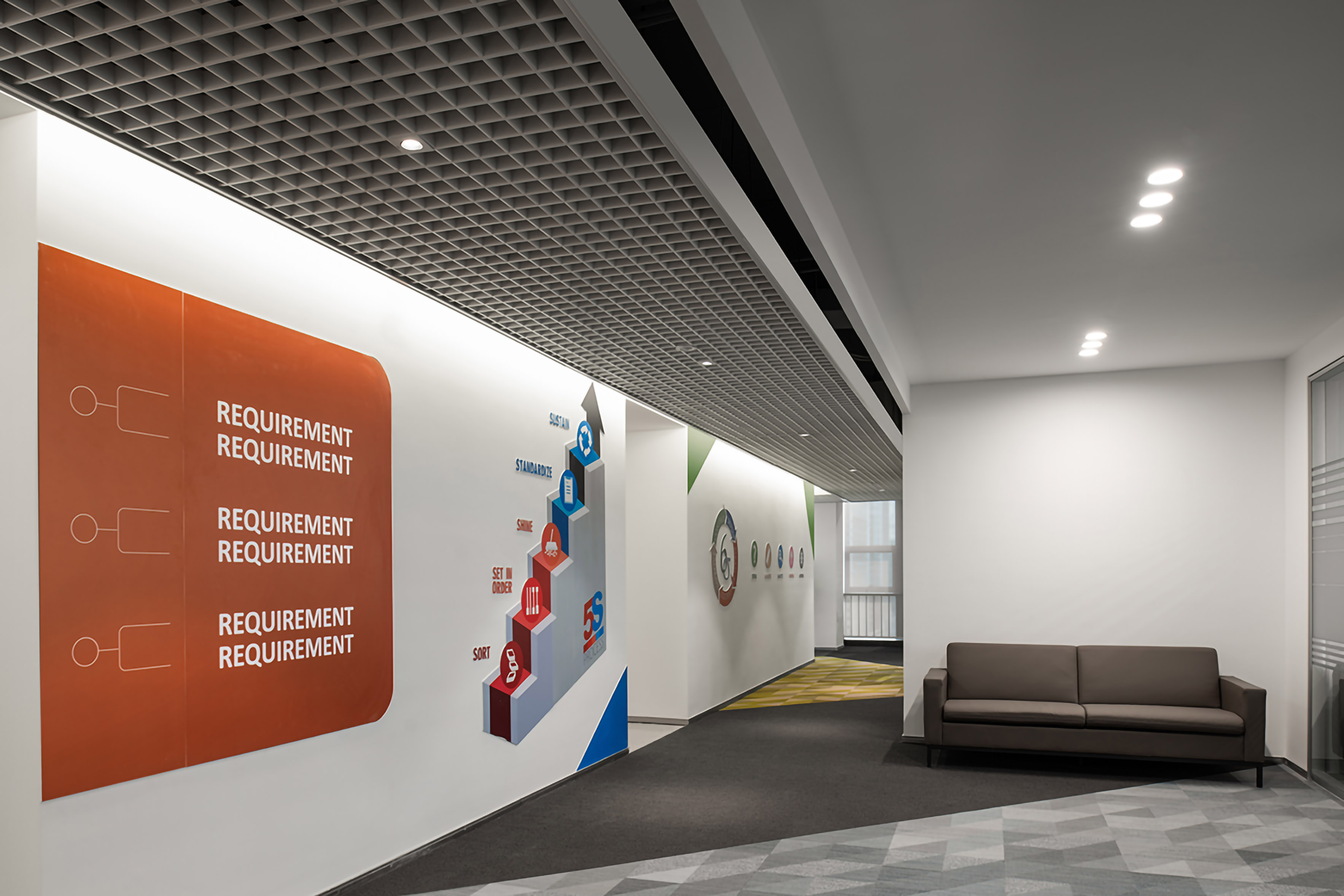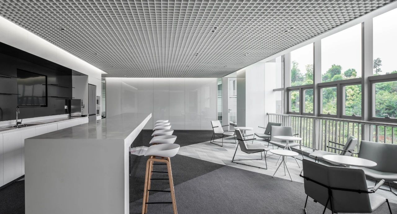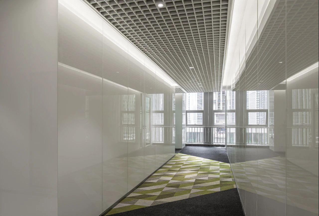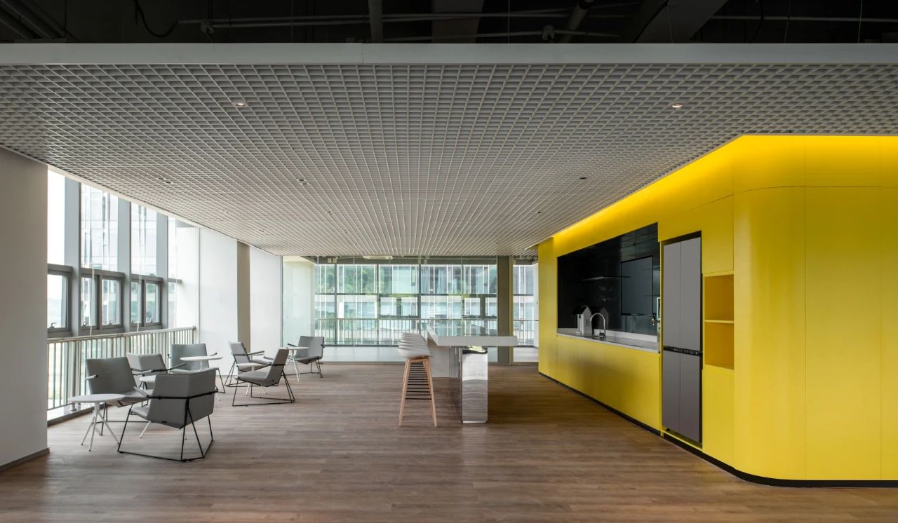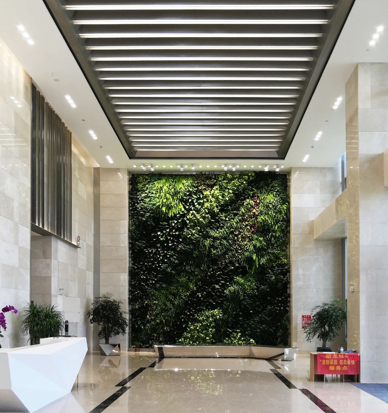 随着科技及生活水平的提高,人们更关注人性化及人类健康及智能化等问题。项目中采用智能绿植,既美化空间又增加环境中空气负离子数量从而净化空气。智能浇灌养护系统让大面积绿植墙更方便养护。大楼办公层智能门禁系统实现人脸识别,会议楼层会议室装配了智能会议系统,实现空间共享智能预约。会议室同步配备智能窗帘、灯光、空调,配合会议的不同时段及模式,让智能会议便捷有效节省资源。大楼室内以装配化及可重复利用为原则。减少墙体,以全开放灵活隔断装配为自主。天花以裸露原建筑天花为主,个别楼层采用吊装式吸声板,均可重复利用。