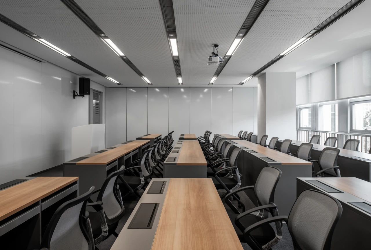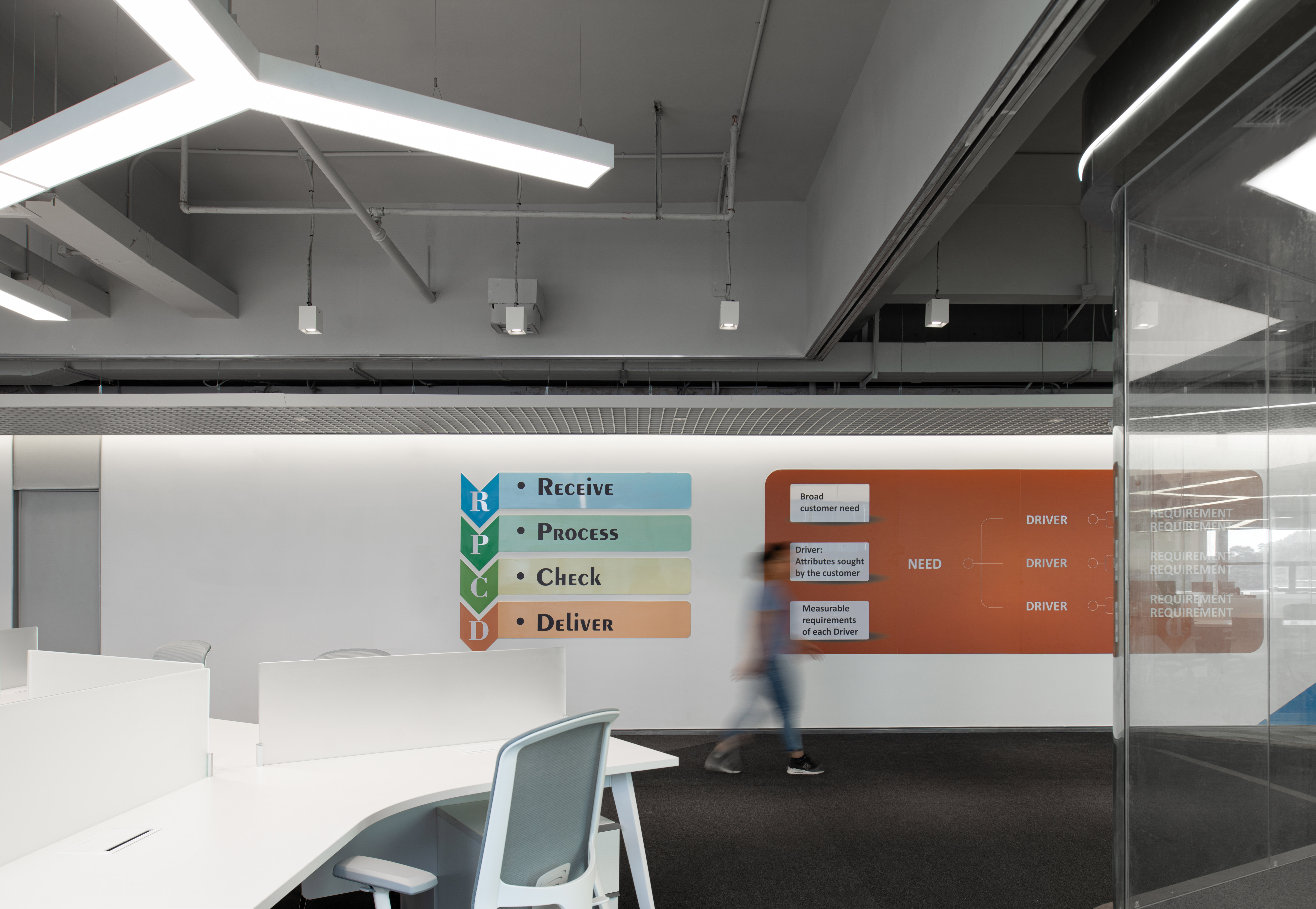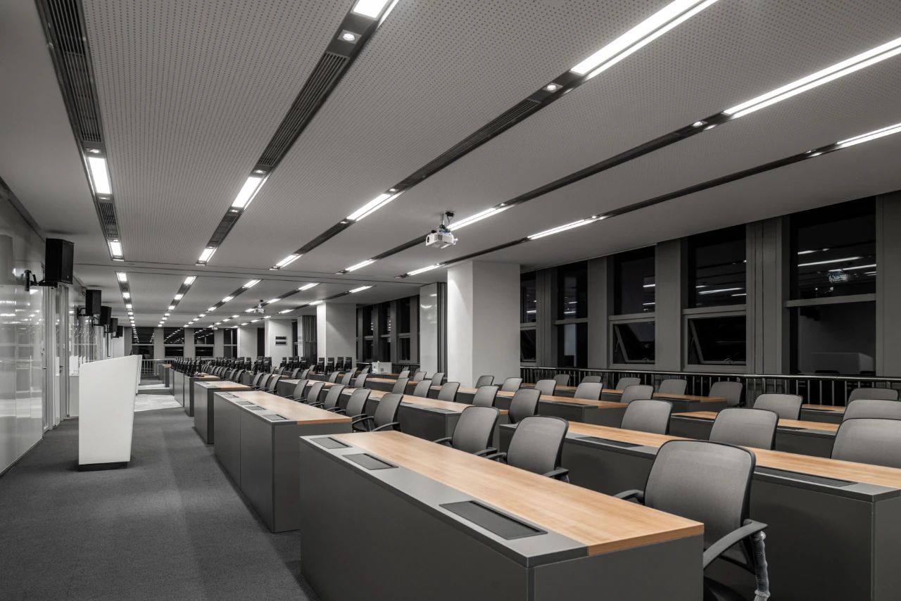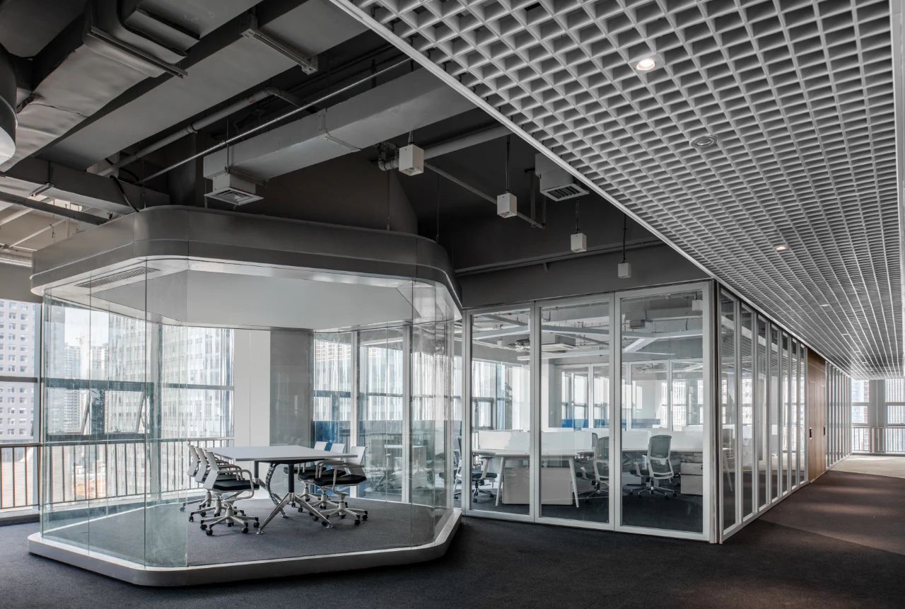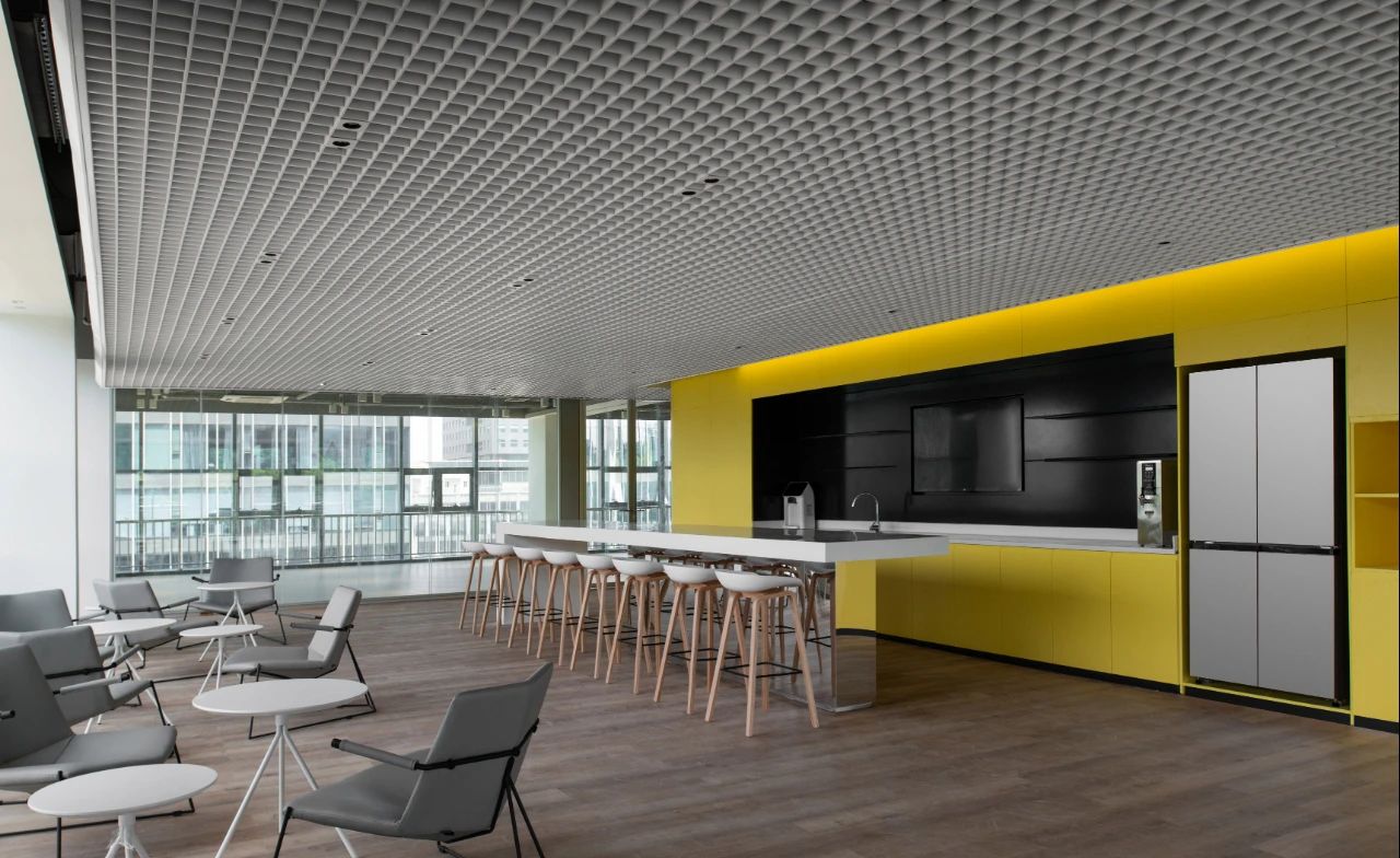 随着科技及生活水平的提高,人们更关注人性化及人类健康及智能化等问题。项目中采用智能绿植,既美化空间又增加环境中空气负离子数量从而净化空气。智能浇灌养护系统让大面积绿植墙更方便养护。大楼办公层智能门禁系统实现人脸识别,会议楼层会议室装配了智能会议系统,实现空间共享智能预约。会议室同步配备智能窗帘、灯光、空调,配合会议的不同时段及模式,让智能会议便捷有效节省资源。大楼室内以装配化及可重复利用为原则。减少墙体,以全开放灵活隔断装配为自主。天花以裸露原建筑天花为主,个别楼层采用吊装式吸声板,均可重复利用。