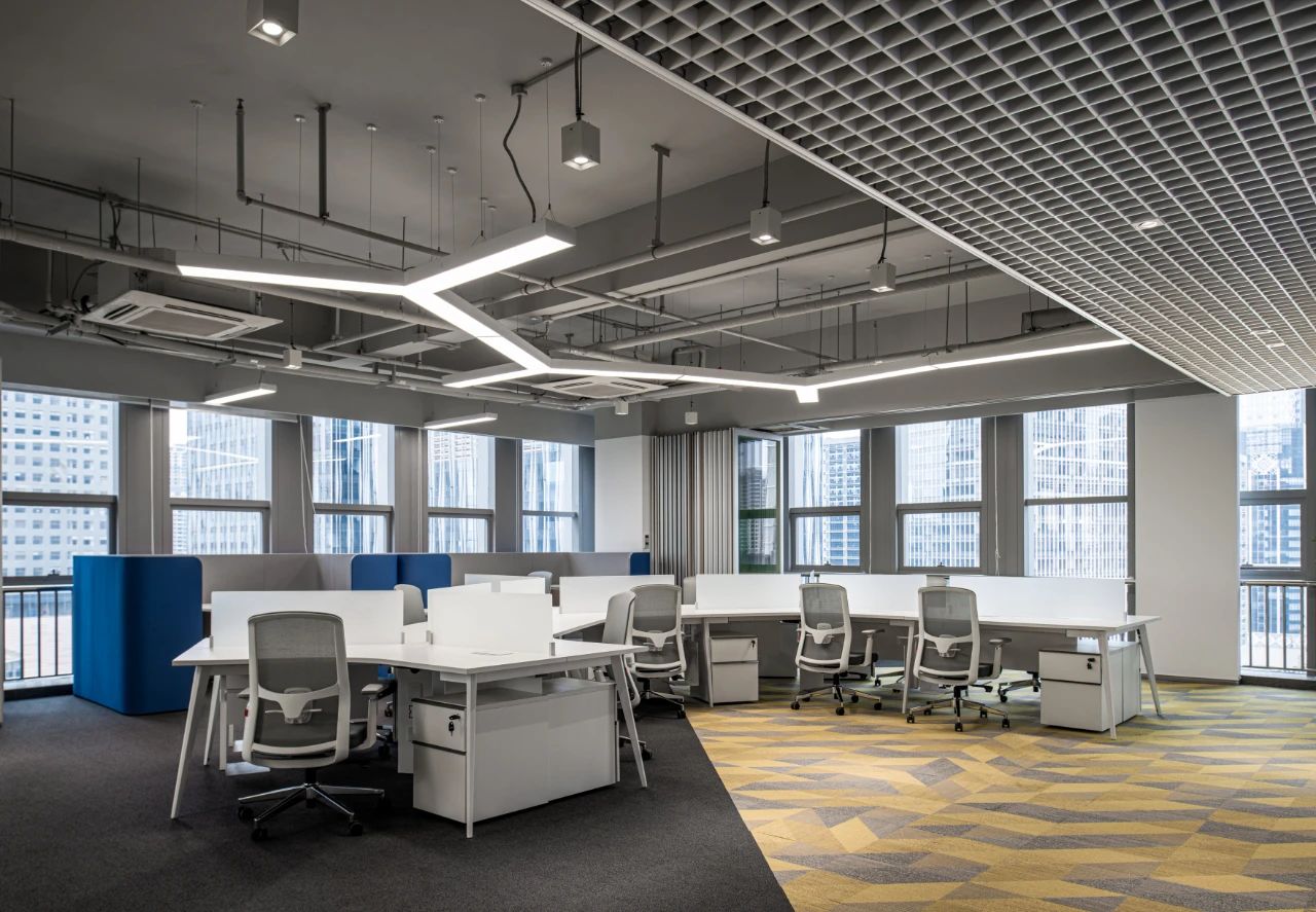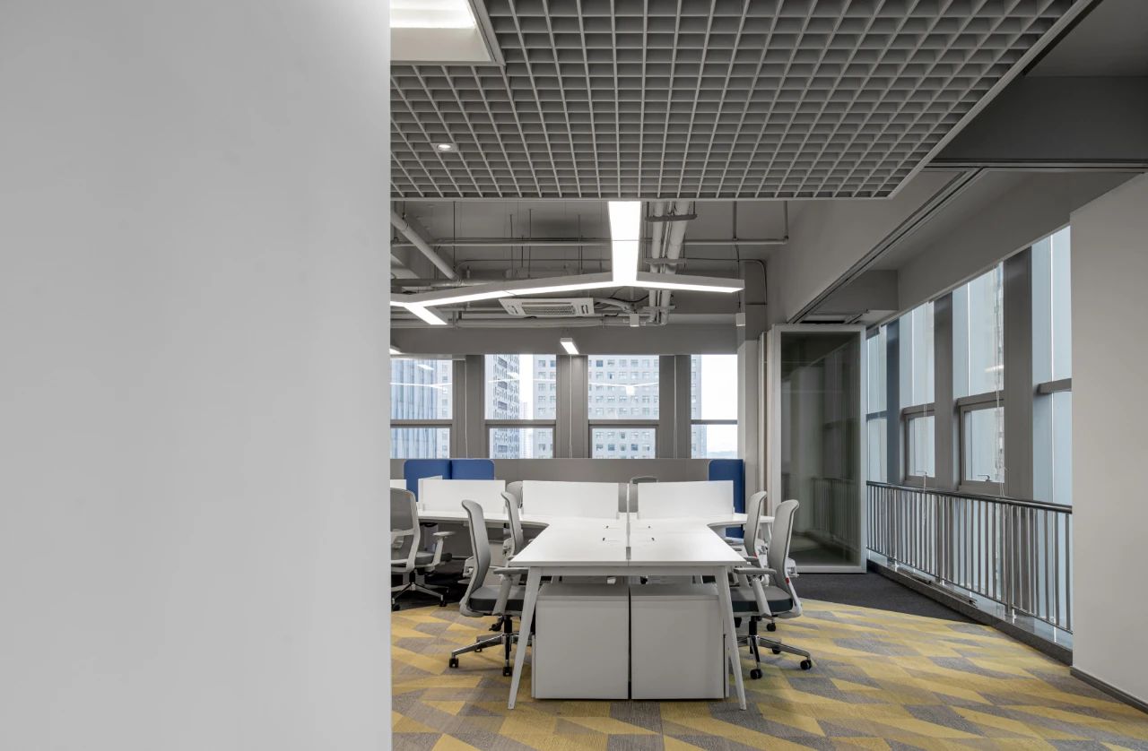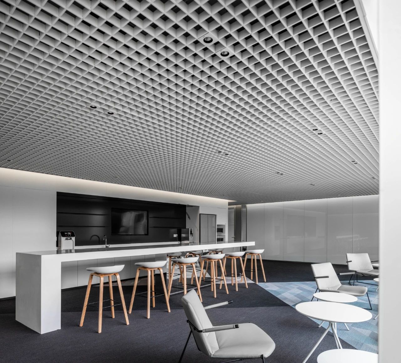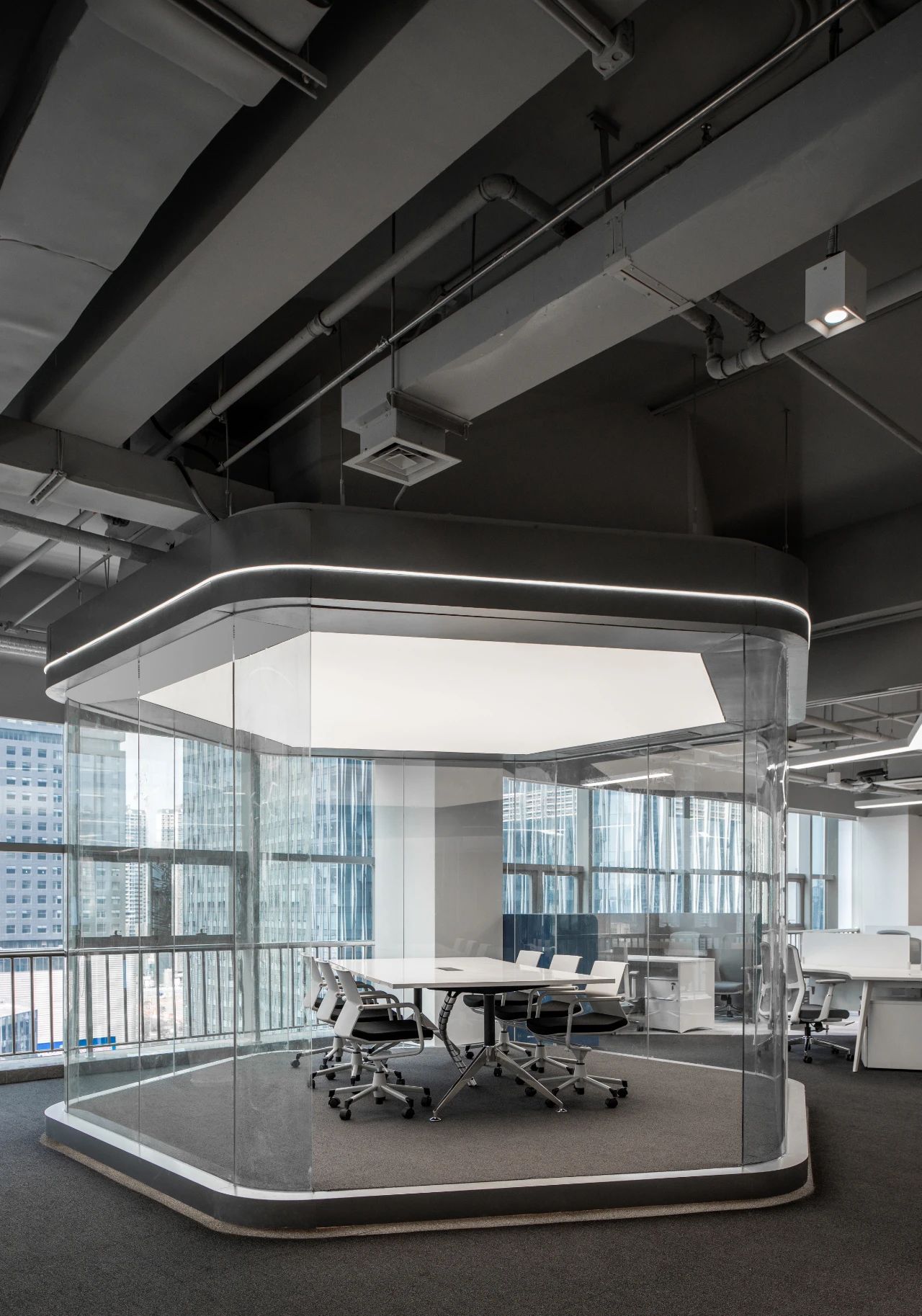 大堂双向通道,缓解上下班高峰期的拥堵。室内绿植与休息等候区结合相映成趣,感受自然和谐。前台及形象墙空间居中,对称格局端庄大雅之堂。办公楼层以开放、连通、共享为主。办公层全开放布局,整层通透明亮确保充足的自然采光。办公家具以不规则组合形式分组布置,划分阵列又相互衔接,在阵列分布的办公位中又沉浸式置入独立的共享会议空间。独立的会议室以全玻异形形式放置于近电梯厅处,方便接待的同时又加强办公区稳定感。共享开放茶水休闲区与办公区的衔接相容,让工作氛围自由轻松,实现办公+生活的未来办公模式。