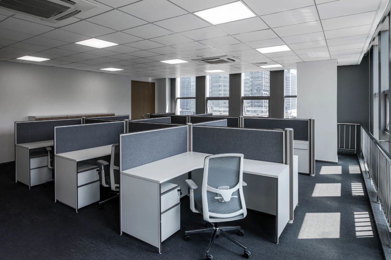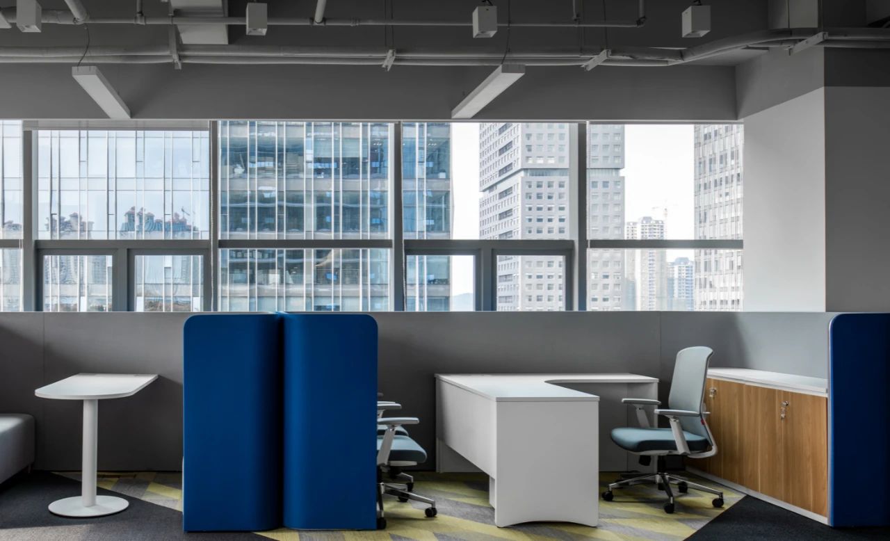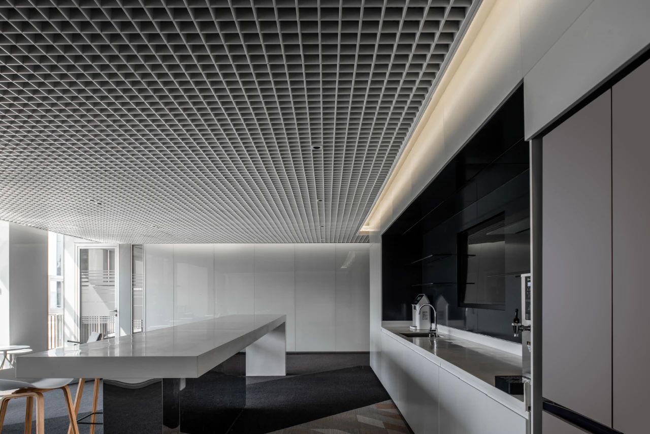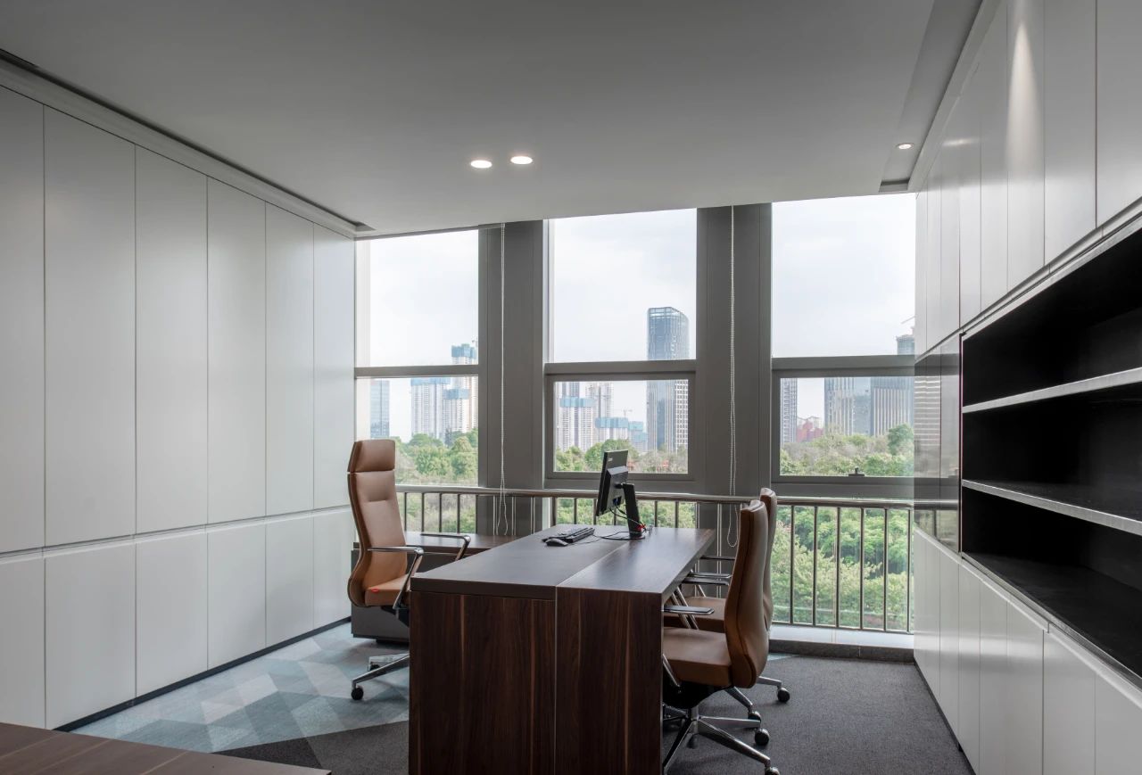 大堂双向通道,缓解上下班高峰期的拥堵。室内绿植与休息等候区结合相映成趣,感受自然和谐。前台及形象墙空间居中,对称格局端庄大雅之堂。办公楼层以开放、连通、共享为主。办公层全开放布局,整层通透明亮确保充足的自然采光。办公家具以不规则组合形式分组布置,划分阵列又相互衔接,在阵列分布的办公位中又沉浸式置入独立的共享会议空间。独立的会议室以全玻异形形式放置于近电梯厅处,方便接待的同时又加强办公区稳定感。共享开放茶水休闲区与办公区的衔接相容,让工作氛围自由轻松,实现办公+生活的未来办公模式。